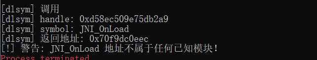 当 dlsym 函数被调用查询 JNI_OnLoad 符号时,返回的函数地址完全不在任何已知模块的内存区间内——Process.findModuleByAddress(func_addr) 无法找到该地址所属的模块,直接打印“警告: JNI_OnLoad 地址不属于任何已知模块!地址伪造实锤!”。