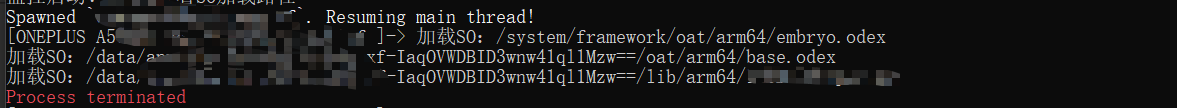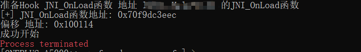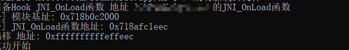从日志中可以清晰看到:脚本成功检测到目标 SO 加载,成功找到 JNI_OnLoad 函数地址,并打印“成功开始”,但始终没有打印“成功结束”。