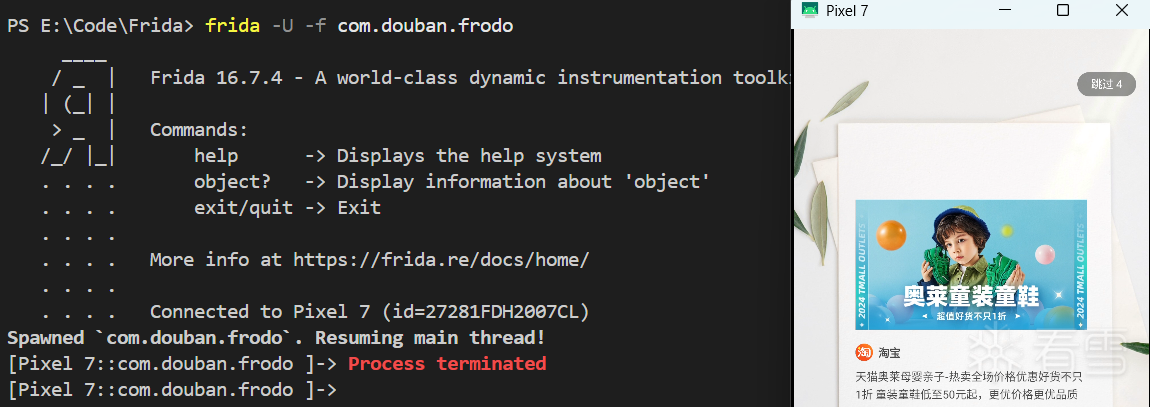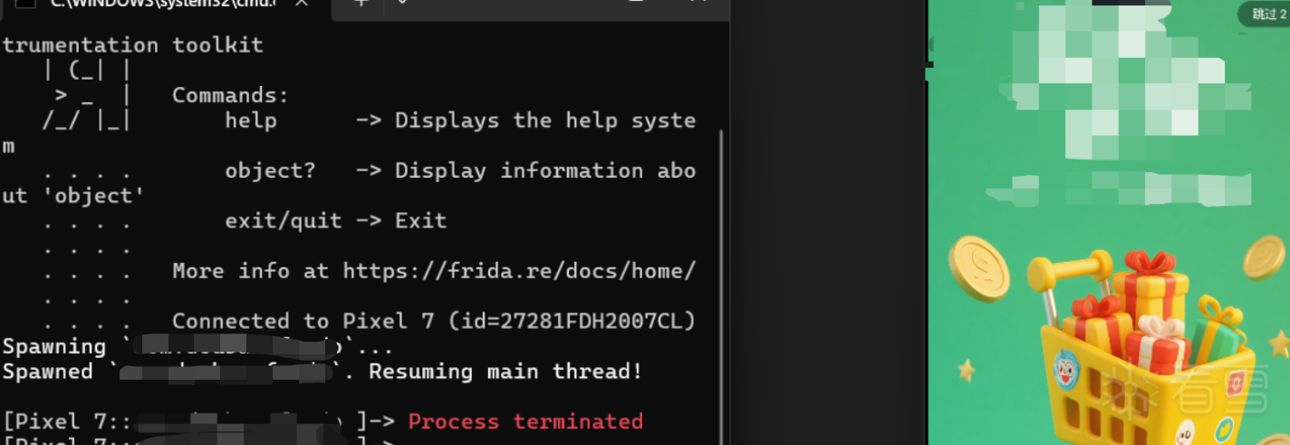 进入frida之后,发现frida马上就退出了,而程序正常运行: