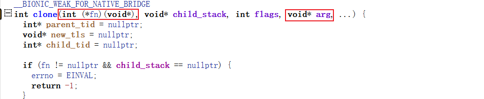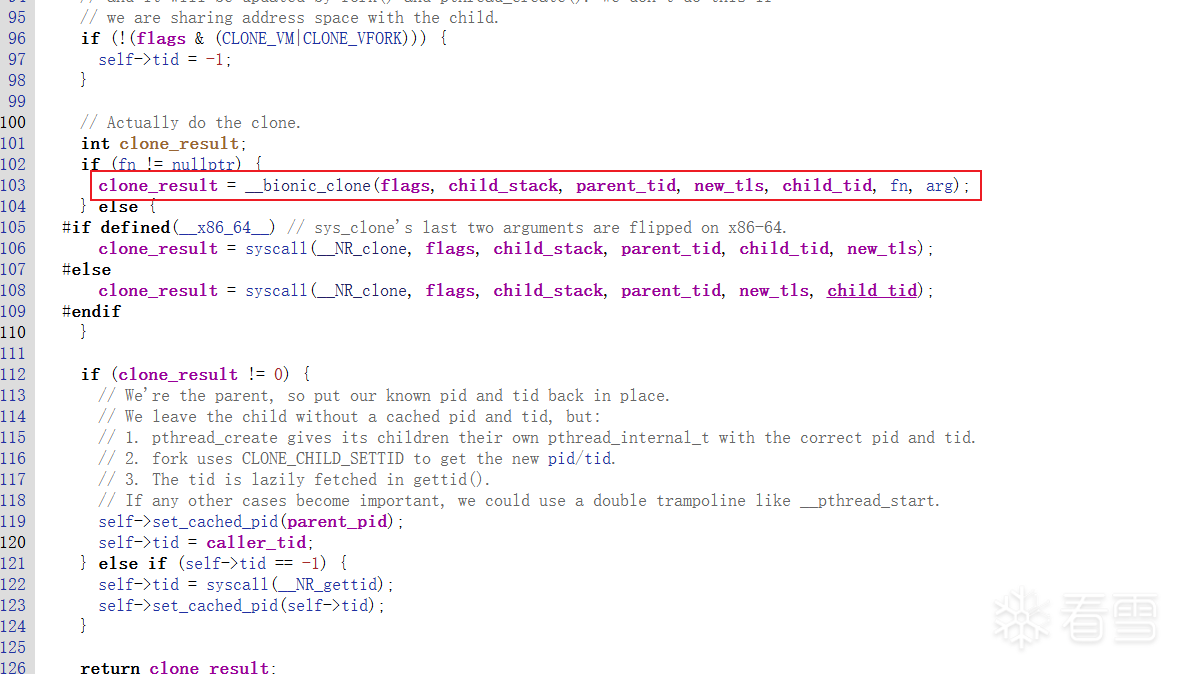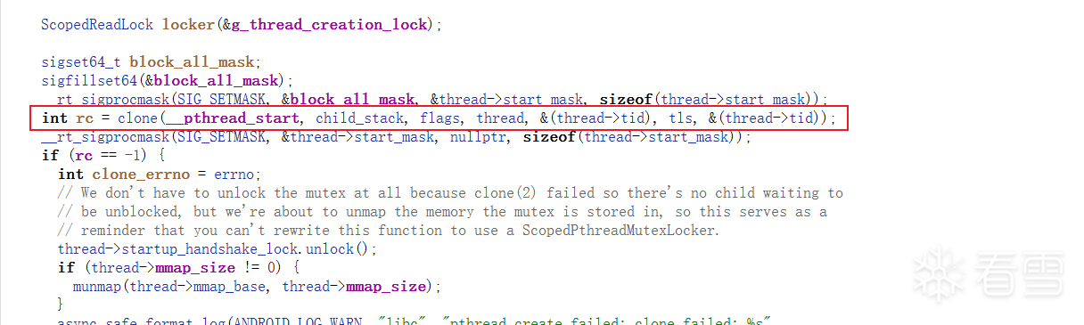 可以看到函数声明:fn就是__pthread_start,arg就是thread,接着往下分析:下面会判断fn是否为空,如果有值则调用__bionic_clone,来进行系统调用进行创建线程。