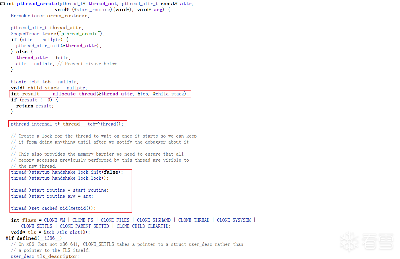 有了上面的了解之后就能够来分析pthread_create的调用链了。这个函数可以在源码当中的/bionic/libc/bionic/pthread_create.cpp当中找到: