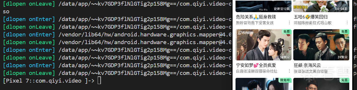 到这里就不再细究java层了。经过资料查找发现,有不少app都有使用了这个so来进行检测,这里找到最新版的某艺进行测试,依旧是使用一模一样的frida脚本,然后进行hook,发现是可以完成Frida的注入的: