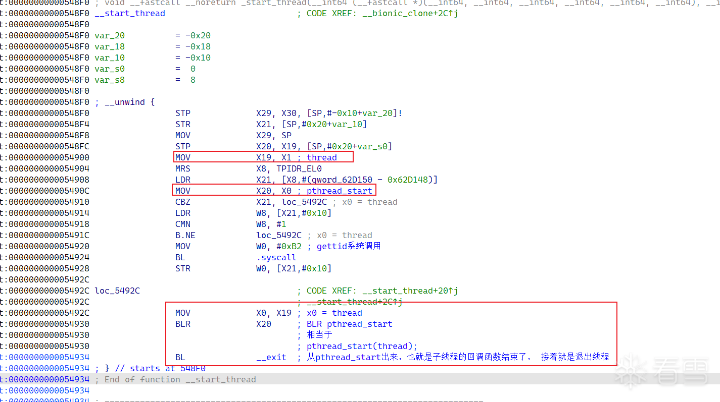 这里系统调用之后如果返回的是子线程的空间的话,sp已经变成了子线程的栈帧。然后回进入__start_thread这个函数当中。此时x0是pthread_start的函数地址,x1是结构体地址。