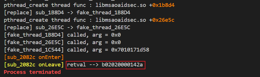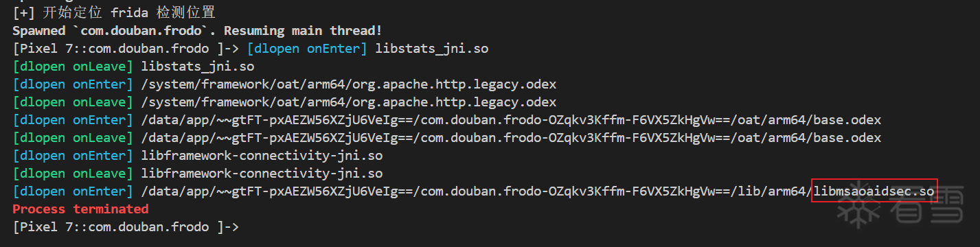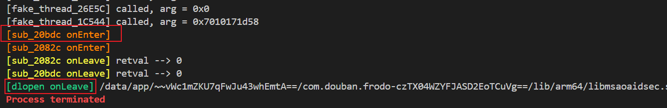 在onEnter和 onLeave的位置输出一下提示,由于这个frida检测是通过退出自己的进程来打断frida注入的话,那么这个过程中检测的so可能会有下面的行为特征: