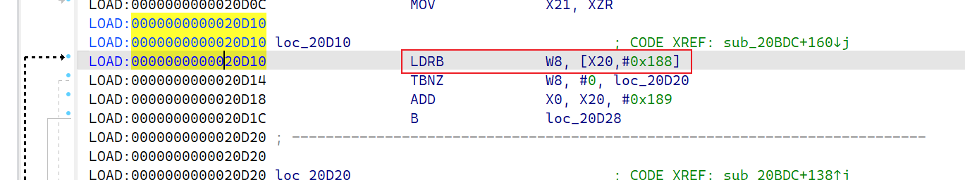 可以看到这里是将W8,这个寄存器当中的值存放到x20+0x188的位置,通过转储信息可以看到此时的 x20 = 000b02020000142a而加上0x188之后就是这个fault addr了,那么此时需要找到这个x20,到底是从哪里来的。