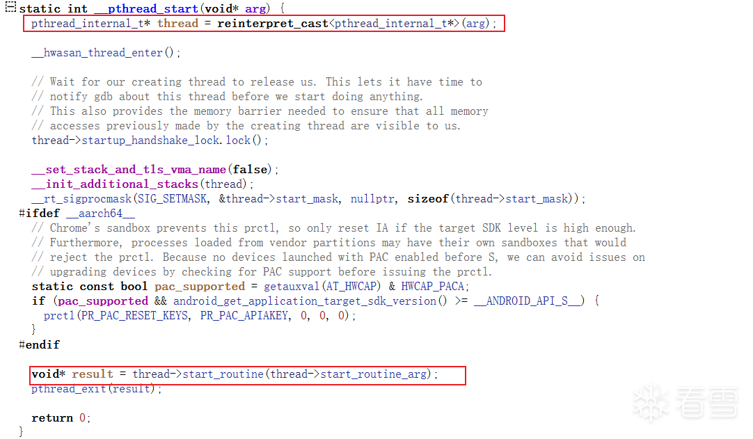 可以看到传入的arg参数就是thread,接着会在后面调用thread当中的回调函数,也就是pthread_create传入的回调函数地址。综上所述,pthread_create的调用链大致如下(在其他不同版本的设备中可能会不太一样):