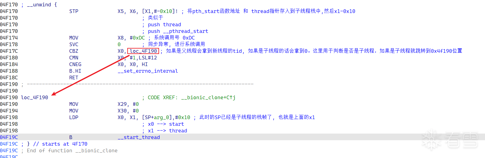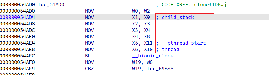 这里是对照着源码的参数进行标记的。完成后进入__bionic_clone进行分析,汇编代码分析如下