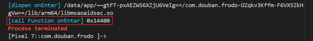 运行之后,发现是在这个0x14400函数退出进程的,因为并没有从这个函数onLeave,也就是检测在这个.init_proc函数当中。