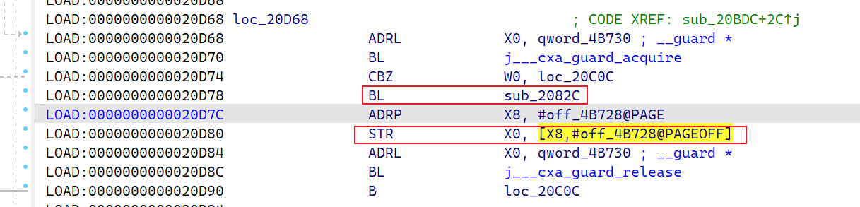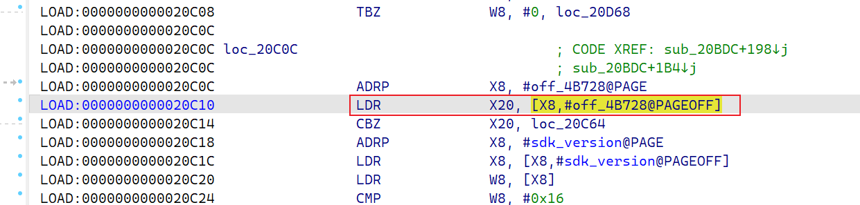 这里将x20高亮一下,然后再函数开头发现是从这个 [X8,#off_4B728@PAGEOFF] 中取出来的,接着找这个标签: