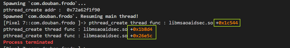 以Spawn方式注入,输出如下,可以发现能够找到对应so当中相关的线程函数了。