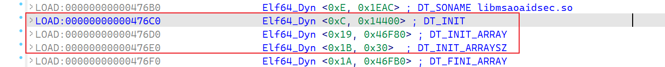 经过hook发现,进行检测的地方在这个libmsaoaidsec.so的so当中。而且可以看到的是在dlopen onLeave之前,这个进程就已经退出了,可以初步判断这个检测的位置大致是在init_proc,init_array执行过程当中,因为JNI_Onload的调用时机是在dlopen之后,所以需要对这个so当中的init_proc和init_array进行主要分析