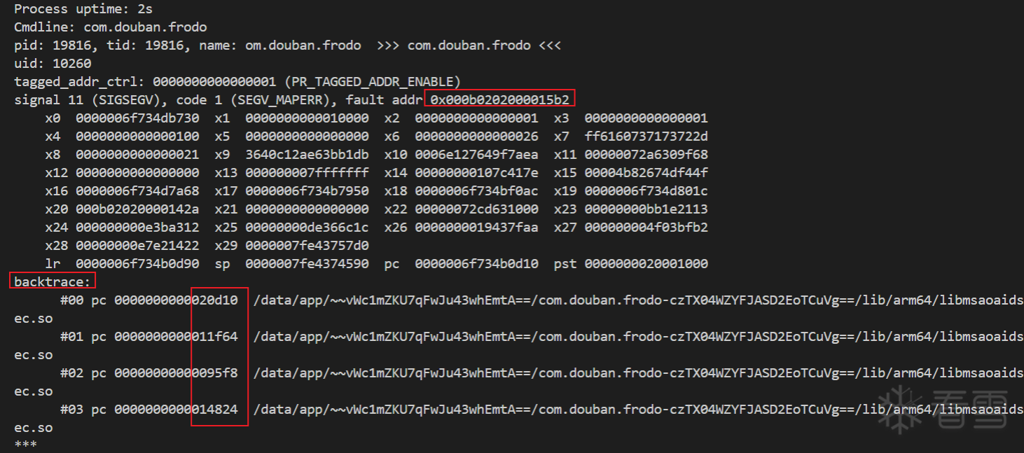 通过转储信息可以看到一个是fault addr = 0x000b0202000015b2,另一个是backtrace,当中的调用堆栈。现在就需要去IDA当中通过调用堆栈回溯一下发生这种问题的点可能在哪里。