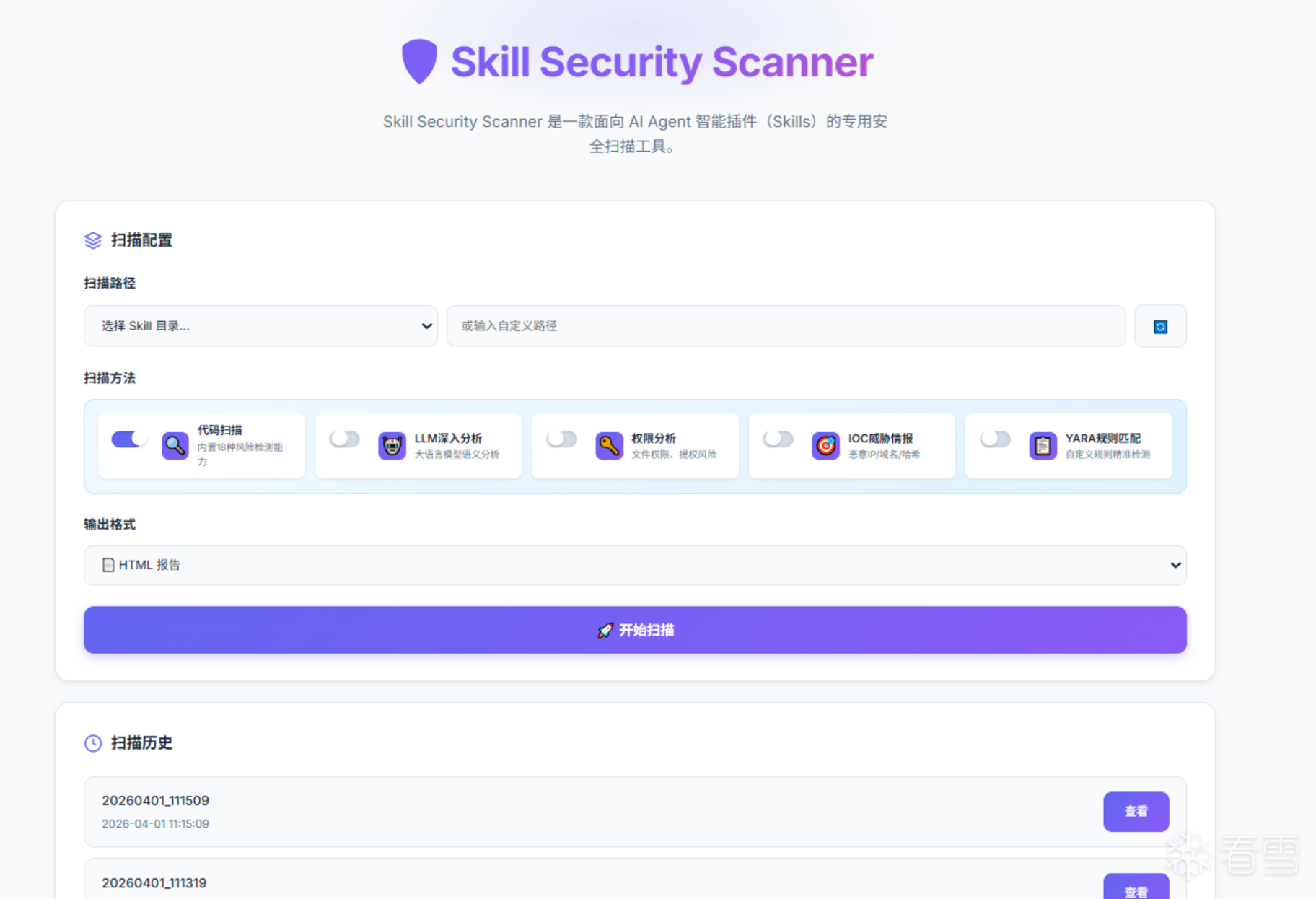 Skill Security Scanner 是一款面向 AI Agent 智能插件(Skills)的专用安全扫描工具,专注于深度检测技能代码中的安全漏洞、恶意行为与风险模式,为 AI 智能体插件全生命周期提供安全审计与风险管控能力。