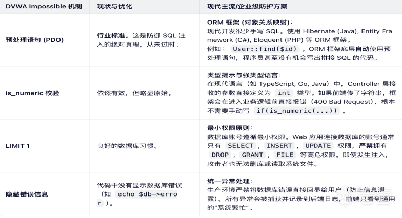 即使攻击者绕过了 is_numeric(假设输入了 1 or 1=1),数据库也会将其视为一个字符串或整数去查找 ID 为 "1 or 1=1" 的用户,而不是执行逻辑运算。