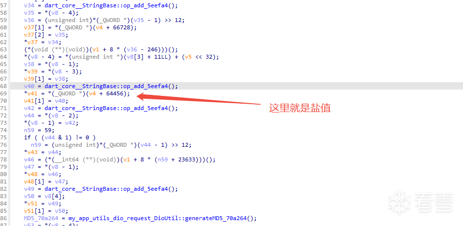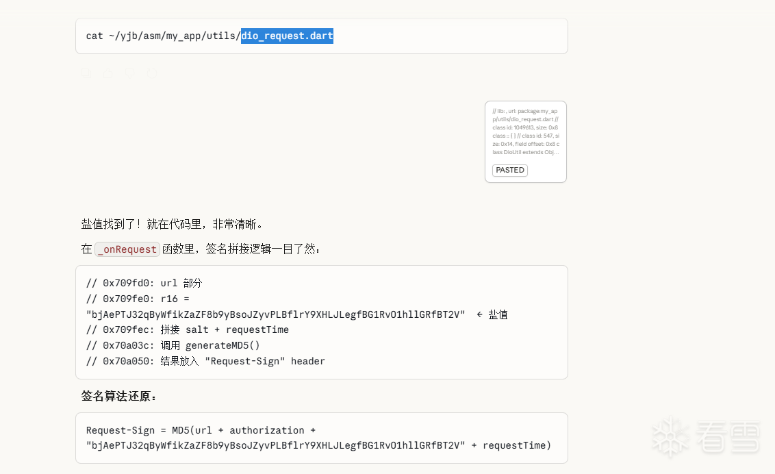 - 其实到这里如果只是为了搞算法的话就已经可以将输出的asm里面的dio_request.dart导出文件丢给ai去分析就行了,针对这个app因为我已经知道它是一个加盐其未魔改的md5了,所以找盐这种事丢给ai完全可以胜任的