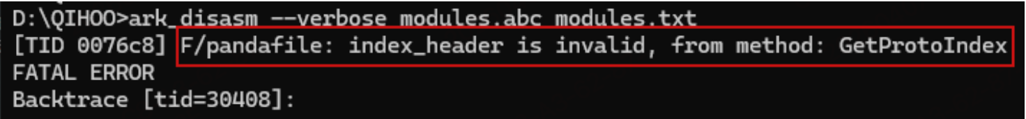 重新运行ark_disasm后,提示F/pandafile: Invalid file offset, from method: GetSpanFromId。很明显,新插入的代码在解析ABC文件时提前中断,导致方法名或类名无法打印。因为重新构造的ABC文件在某处偏移错了。故去掉方法名和类名打印,只打印偏移(methodID),重新编译ark_disasm。