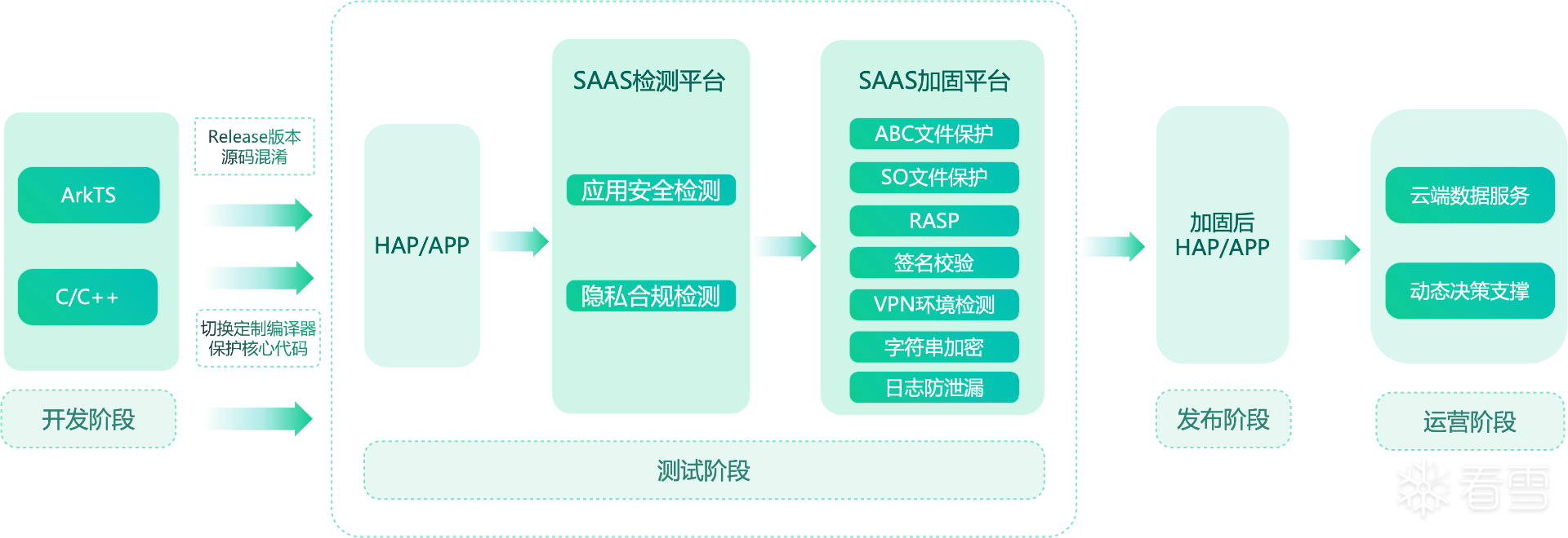 三六零天御鸿蒙应用安全保护方案通过持续的技术革新与深度优化,提供安全合规检测和安全加固服务,覆盖鸿蒙应用开发、测试、发布、运营全生命周期,通过构建从源头设计到持续运维的端到端防护机制,形成鸿蒙生态纵深安全防护体系。