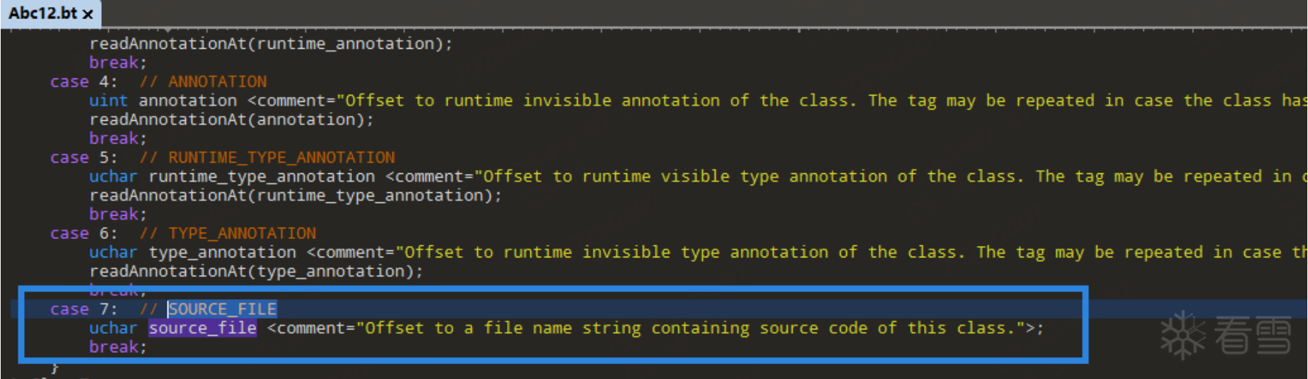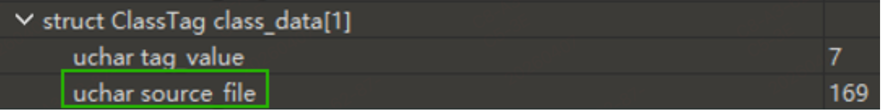 所以class_data的tag根本不存在0x38和0x2C。也就是说当tag等于7的时候,后面的偏移解析错误了。问题很有可能出现在下图中的绿色框中。此时需要确认一下,SOURCE_FILE是占几位。