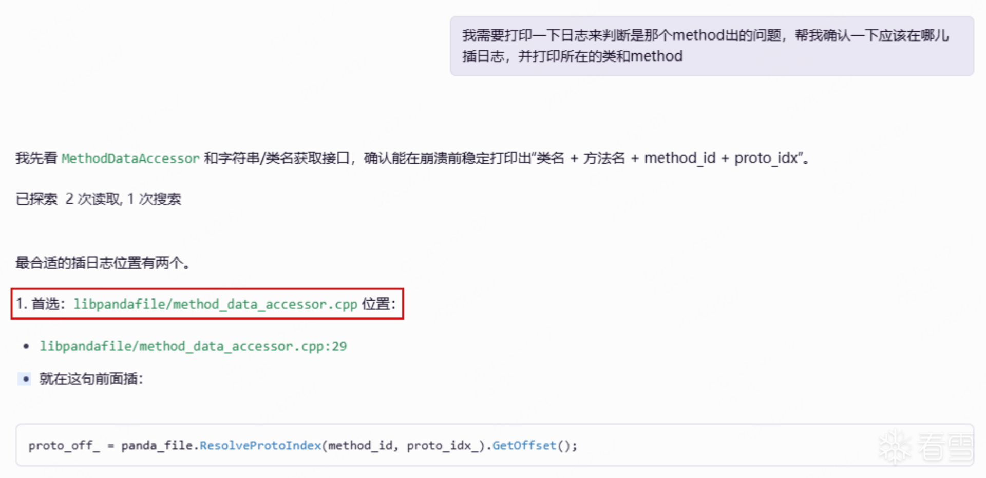 提示词:我需要打印一下日志来判断是哪个method出的问题,帮我确认一下应该在哪儿插日志,并打印所在的类和method |
