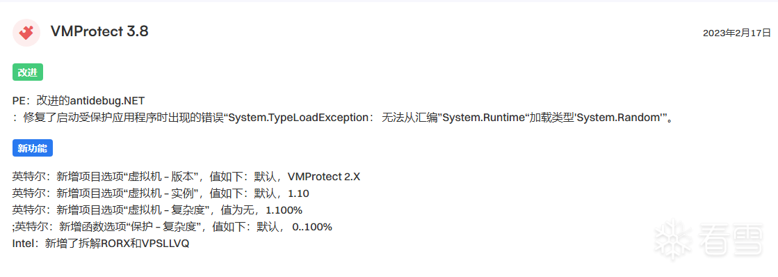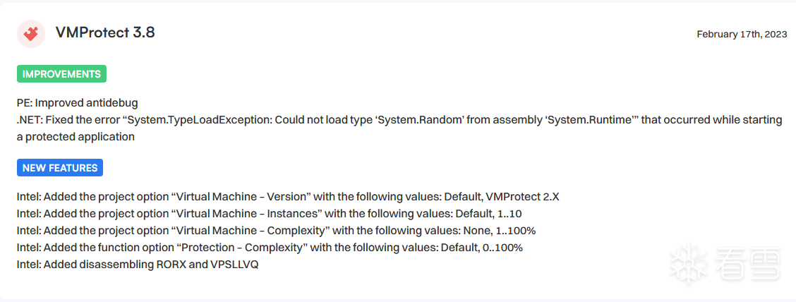 我们可以看到这里增加好的选项,这些选项可不是简简单单的混淆,每一个拿出来都是王炸,毫不夸张的说如果3.8版本之后的VMProtect是一位浑身都是的肌肉的猛男,那么3.8版本之前的VMProtect只能算是一个娇羞的小萝莉,我们可以看到3.8更新的时间点是2023年初,这里我们大家可以讨论一下VMProtect3.8的大更新是不是因为源码泄露而做出的紧急补救手段,因为VMProtect3.8发布的时间恰巧也是源码泄露的那段时间,当时我第一次得知VMProtect源码泄露的时候,还以为VMProtect就此跌落神坛,从此一蹶不振,没想到他居然放出大招,这次的大更新可以将其称之为新版VMProtect,他不是像牙膏厂一样挤药膏似的更新,而是夸张到等同于重构了整个源码,增加了非常多的变态混淆策略,在很多地方都进行了非常大的改动。那么接下来我们将逐一分析他的逆天改动
