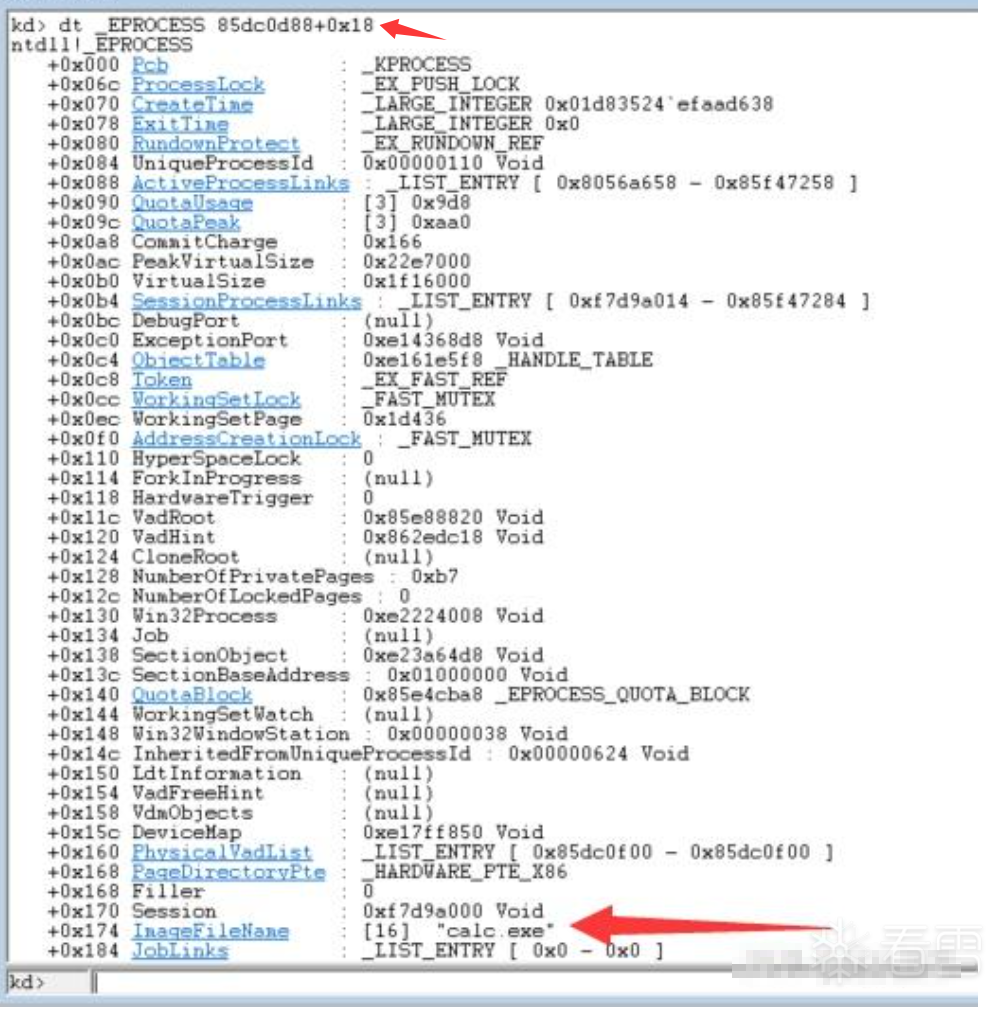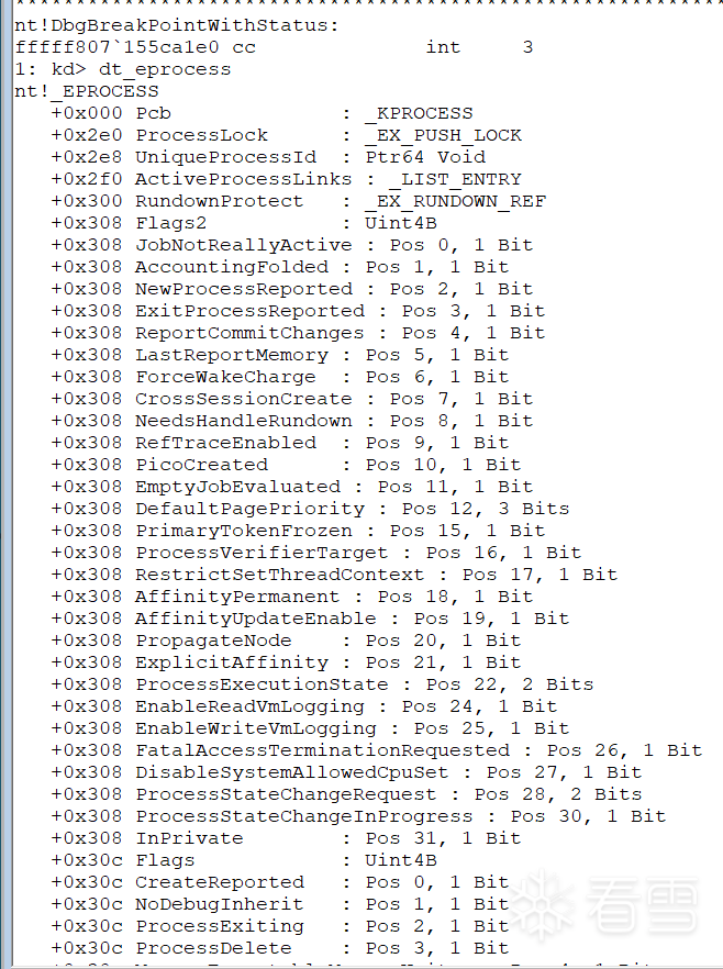 DKOM 隐藏进程的本质是操作EPROCESS结构体,EPROCESS结构体中包含了系统中的所有进程相关信息,还有很多指向其他结构的指针,首先我们可以通过WinDBG在内核调试模式下输入dt_eprocess 即可查看到当前的EPROCESS结构体的偏移信息,结构较多。
