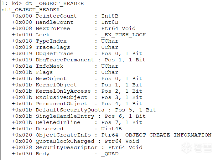 OBJECT_TYPE_INITIALIZER TypeInfo;#ifdef POOL_TAGGING ULONG Key;#endif //POOL_TAGGING ERESOURCE ObjectLocks[ OBJECT_LOCK_COUNT ];} OBJECT_TYPE, * POBJECT_TYPE;typedef struct _OBJECT_HEADER {