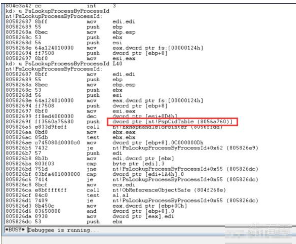 PspCidTable = **(PULONG*)((ULONG)PsLookupProcessByProcessId + 26); // 找到PspCidTable的地址 DbgPrint("PspCidTable = %x\n", PspCidTable);