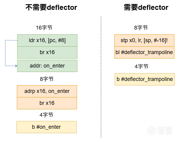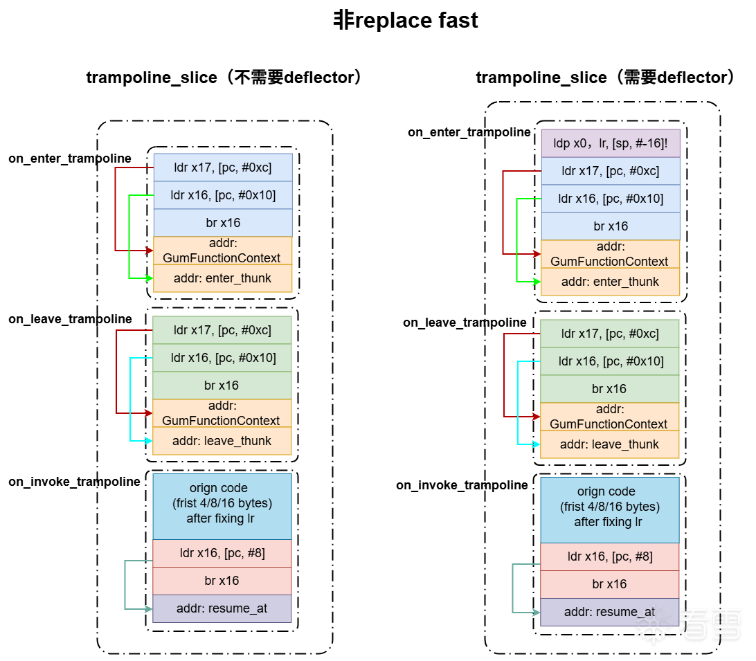 话说这需要deflector的流程中,4字节inline hook的一级跳板并没有将x0、lr存入栈中,但它同样也跳转到on_enter_trampoline,根据二级跳板的生成,需要中继器deflector的会在on_enter_trampoline写入第一条指令ldp x0,lr, [sp, #-0x10]!,这样对4字节的inline hook不会有什么影响嘛?希望大佬帮忙解答一下我的疑惑。