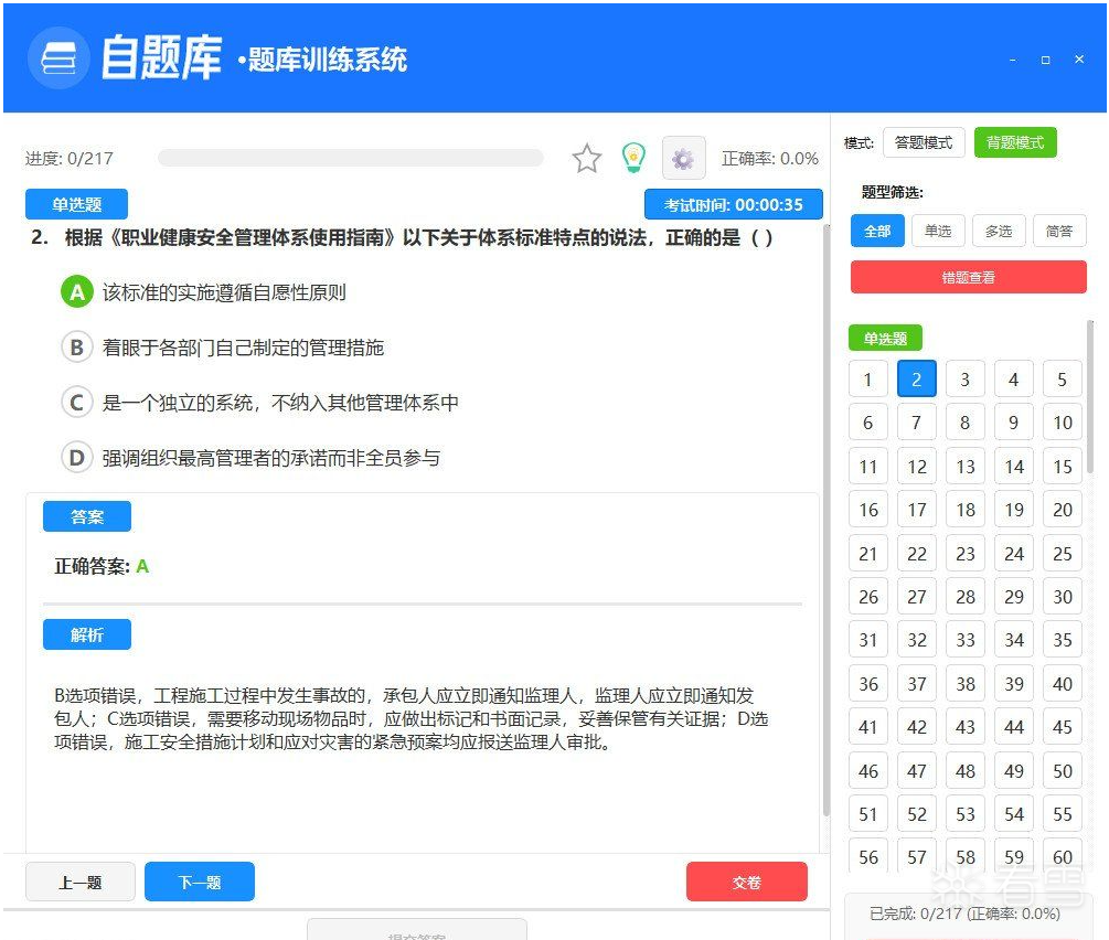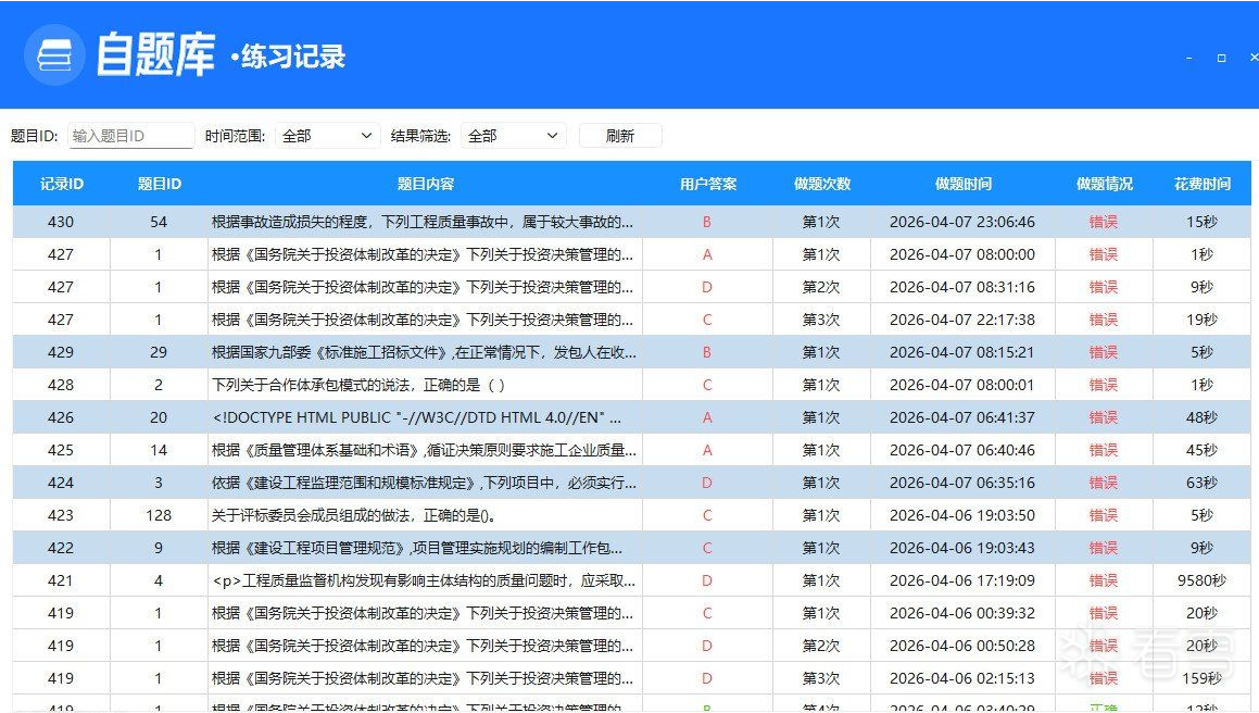 | 自题库V1.0,是我个人根据自己的需求编程的一个款软件。原本打算是用别人既有的软件,总觉得存在问题不符合自己的需求,主要情况如下: 1、做题界面不友善; 2、不能自己新建题库; 3、题目不能加载图片,如我们需要做一些带图片表格的流水时间计算,没有图片的话,完全无法正常做题; 4、想对题目进行分类标记,不仅仅是收藏,如:计算题、流水时间计算等; 5、解析内容想加入富文本编辑器,可以独立标记颜色; |
