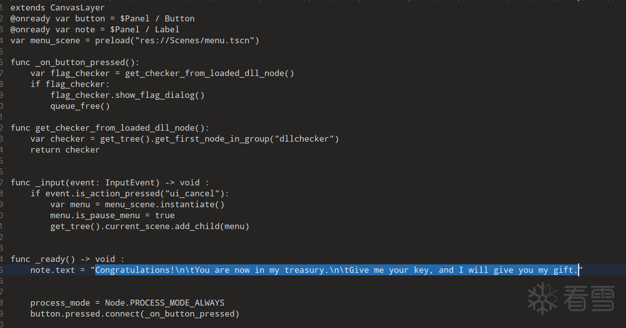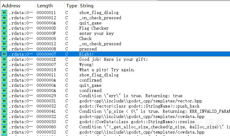 由于引擎的开源属性,godot游戏反逆向还是具有挑战性的,毕竟源码公开,要破解游戏也只是时间问题。抛开这点不谈,godot游戏反逆向还存在另一个挑战点:引擎中使用了大量ERR_系列宏,导致报错信息大部分是嵌入在程序中的,相关信息如函数名也会被转成字符串嵌在反编译代码中,以此为切入可以很方便地在IDA中找到想要分析的函数。本题就是利用了这一特性来找pck加密使用的密钥,此外笔者在实现dll动态解密时也故意去除了原代码中的ERR_宏使用以对抗分析。