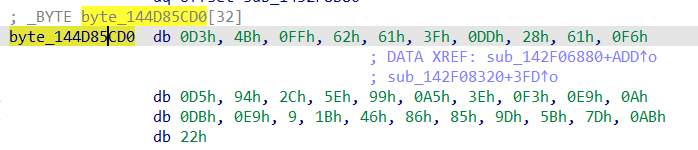 在两个匹配字符串中间可以看到一个for循环,其中循环读取的byte_144D85CD0[i]即为密钥:
