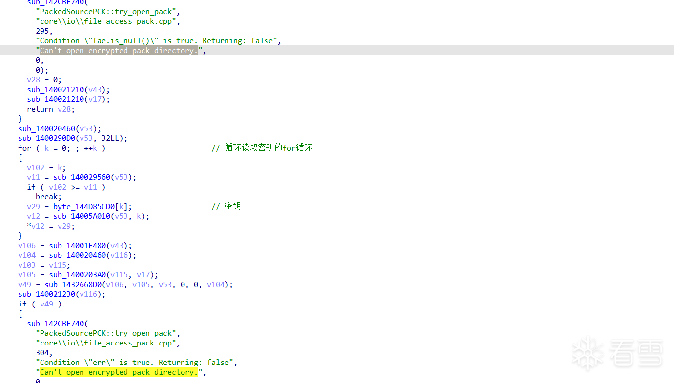 用IDA打开游戏本体,待加载完毕后,打开字符串窗口,搜索”can't open encrypted pack directory“,跟进到字符串出现的函数,如下图