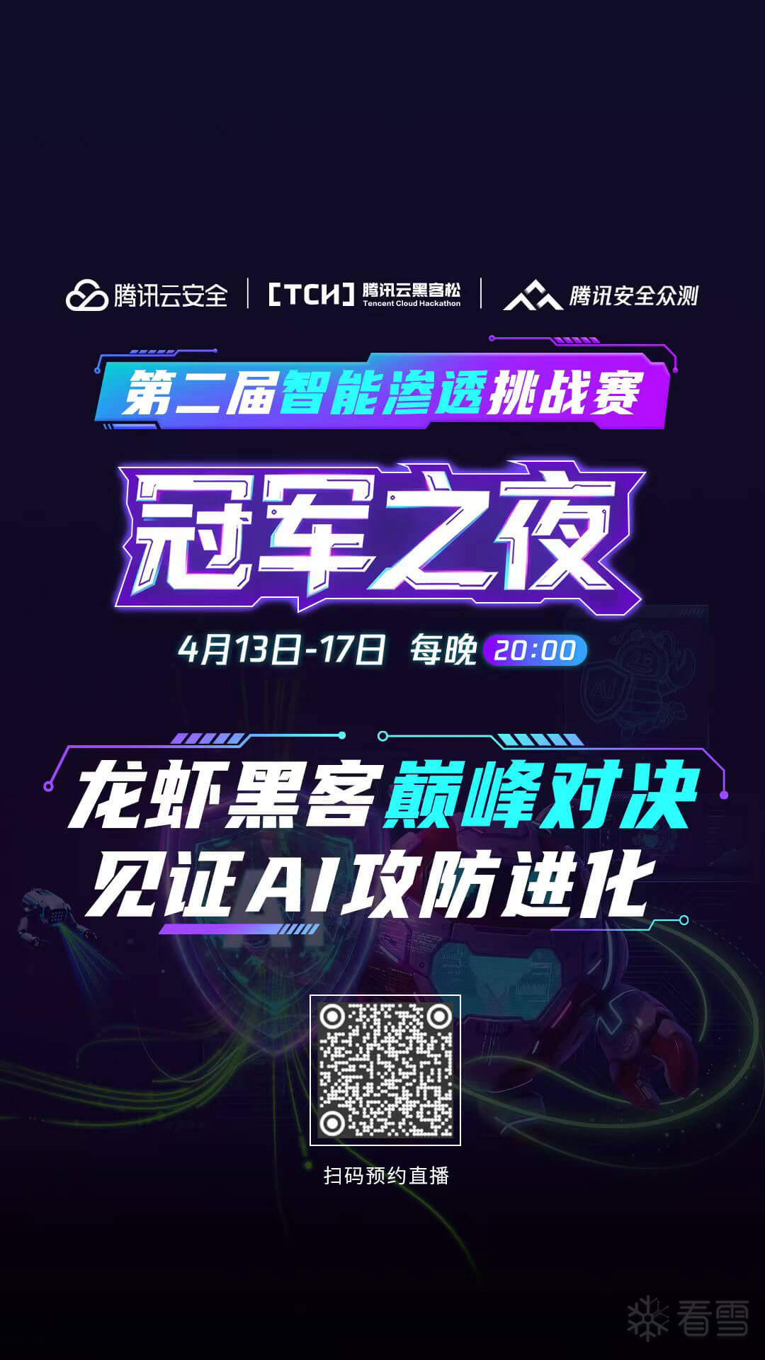 连续5晚8点,锁定赛事直播。看雪创始人段钢主持,携手腾讯智能渗透挑战赛负责人与重磅嘉宾,深度复盘战况、解析智能渗透技术,还原攻防背后的真实博弈。