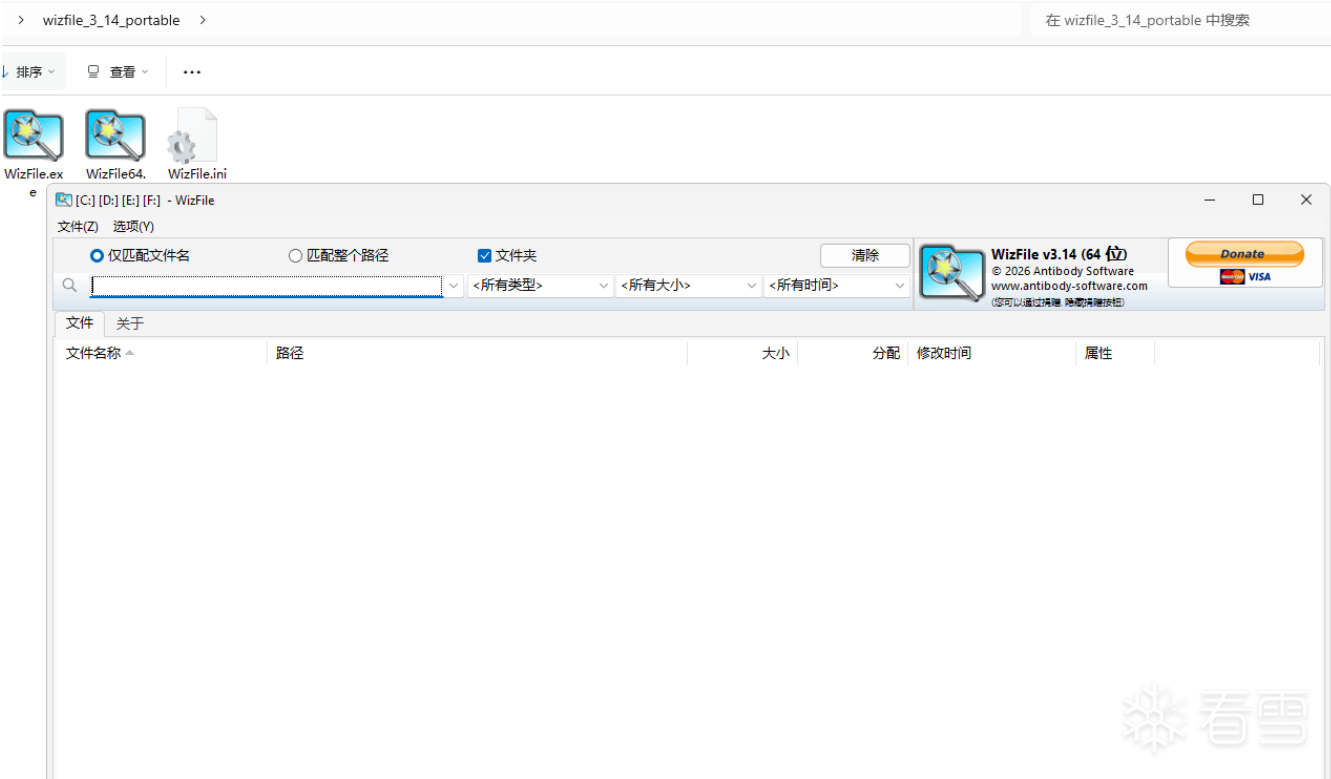 一、工具简介:WizFile 是 Antibody Software(同 WizTree 开发者)开发的Windows 极速文件搜索工具,核心是直接读取 NTFS 硬盘 MFT 主文件表,实现毫秒级、实时、全盘文件搜索,个人免费、轻量无数据库。