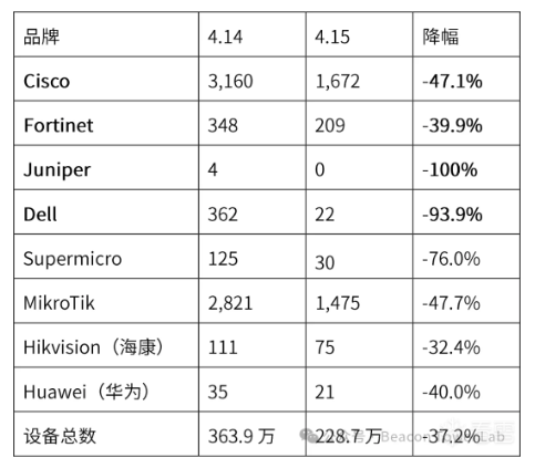 Cisco下降47.1%,Fortinet下降39.9%,Juniper从4台归零。趋势上与“美制设备集体失灵”的报道高度吻合,且降幅明显高于设备总数(-37.2%),表明问题具有品牌选择性。