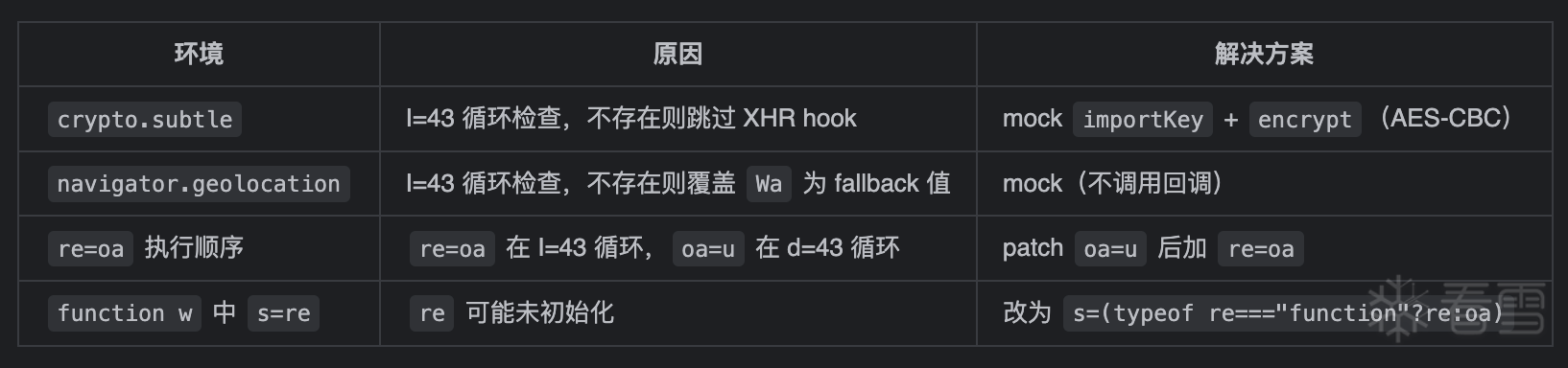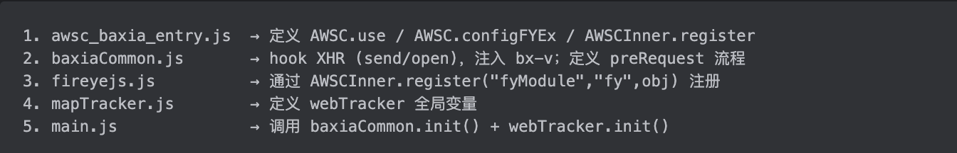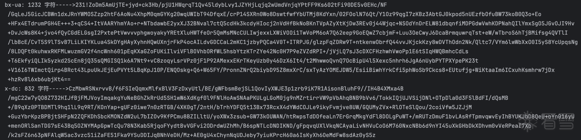 最终方案:手动补环境(如果自己手补环境实在补不出来,也可用jsdom库,测试也可以补出来结果) + canvas + HookableXHR + WebGL mock→ fireyejs register 成功→ configFYEx callback 触发→ getFYToken 返回 1200+ 字符的 token(格式 "231!...") 5、bx-dc生成分析