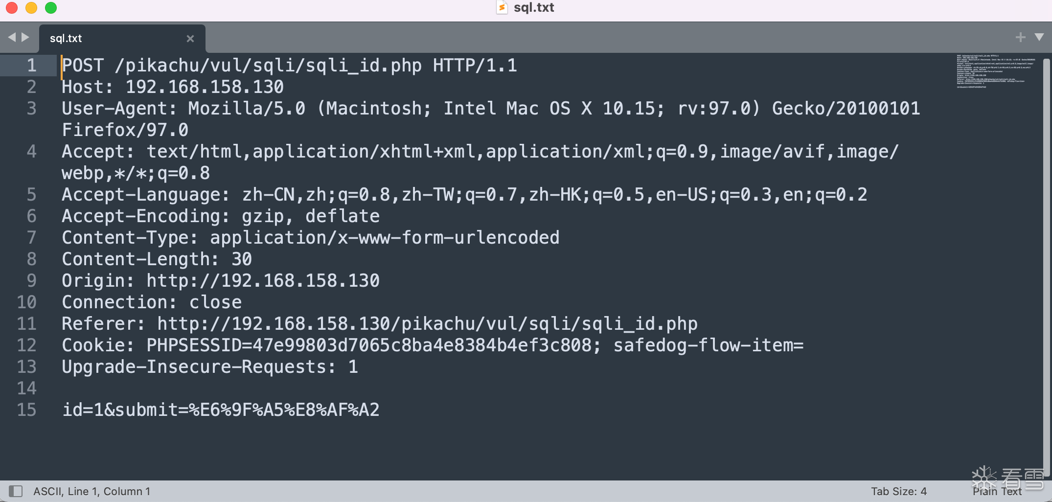POST /pikachu/vul/sqli/sqli_id.php HTTP/1.1Host: 192.168.158.130User-Agent: Mozilla/5.0 (Macintosh; Intel Mac OS X 10.15; rv:97.0) Gecko/20100101 Firefox/97.0Accept: text/html,application/xhtml+xml,application/xml;q=0.9,image/avif,image/webp,*/*;q=0.8Accept-Language: zh-CN,zh;q=0.8,zh-TW;q=0.7,zh-HK;q=0.5,en-US;q=0.3,en;q=0.2Accept-Encoding: gzip, deflateContent-Type: application/x-www-form-urlencodedContent-Length: 30Origin: 0e0K9s2c8@1M7q4)9K6b7g2)9J5c8W2)9J5c8U0p5&6x3W2)9J5k6e0p5$3z5q4)9J5k6e0p5#2z5q4)9J5k6e0p5K6x3p5y4G2L8X3&6W2j5%4c8A6L8$3&6Q4x3@1q4Q4x3U0k6F1j5Y4y4H3i4K6y4n7j5$3I4G2M7$3g2d9k6h3k6W2M7X3g2J5i4K6y4m8i4K6t1$3L8X3u0K6M7q4)9K6b7X3S2@1N6s2m8Q4x3@1q4Q4x3V1k6Q4x3V1j5I4z5e0u0Q4x3X3f1I4y4U0S2Q4x3X3f1I4y4e0S2Q4x3X3f1I4x3K6m8Q4x3V1k6H3K9h3E0S2j5$3S2#2i4K6u0r3N6Y4g2D9i4K6u0r3M7%4q4D9K9g2)9J5c8Y4y4I4L8r3W2Q4y4h3k6A6k6q4)9J5k6i4m8Z5M7p5y4G2L8$3E0A6k6g2)9K6b7g2)9J5y4X3&6T1M7%4m8Q4x3@1u0b7d9q4m8e0c8g2y4e0d9f1c8Q4x3@1b7@1y4$3f1&6z5e0R3H3x3$3b7%4x3o6j5#2j5K6S2T1j5e0c8W2z5o6x3^5y4r3t1@1k6h3j5K6j5K6R3H3z5q4)9K6b7W2)9J5y4X3&6T1M7%4m8Q4x3@1u0K6j5h3k6W2k6r3!0Y4i4K6u0V1k6X3I4G2N6#2)9J5k6r3W2@1k6h3#2Q4x3@1c8g2M7r3N6J5j5h3c8W2i4K6u0V1d9h3&6K6k6h3y4#2M7X3g2Q4x3X3c8d9k6i4q4#2k6i4y4@1M7#2)9K6b7g2)9J5y4X3&6T1M7%4m8Q4x3@1t1I4K9h3c8Q4x3@1b7I4i4K6t1$3j5h3#2H3i4K6y4n7M7%4g2T1L8h3W2@1i4K6y4p5i4K6t1#2c8e0k6Q4x3U0f1&6c8W2)9J5y4f1p5#2i4K6t1#2c8e0S2Q4x3U0g2m8c8W2)9J5y4f1p5J5