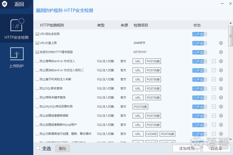 默认安装完安全狗WAF是没有开启POST内容防护的,所以需要手动在网站防护设置中添加POST内容检测项目