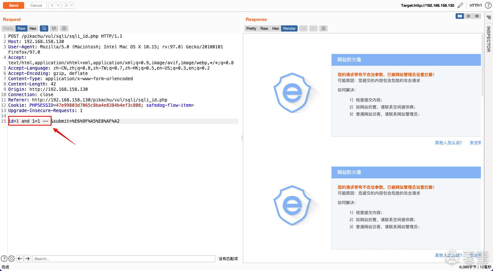 直接使用id=1 and 1=1 -- ,⼀般的WAF都会检测拦截
