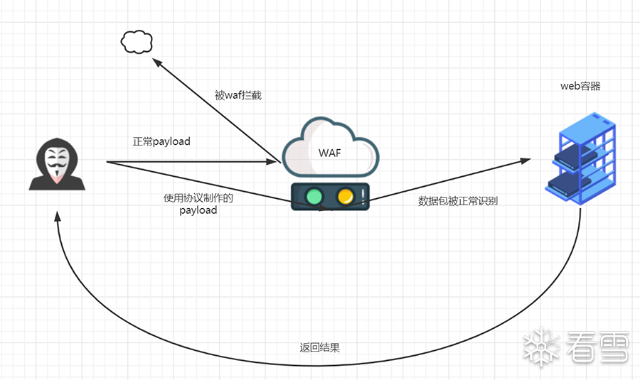 一些比较好的WAF已经对Transfer-Encoding的分块传输做了处理,可以把分块组合成完整的HTTP数据包,这时直接使用常规的分块传输方法尝试绕过的话,会被WAF直接识别并阻断。