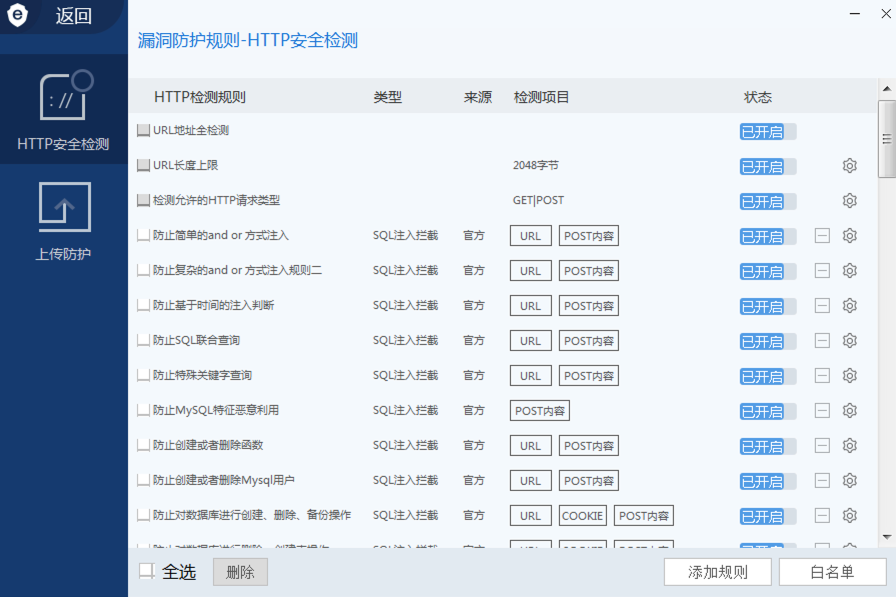默认安装完安全狗WAF是没有开启POST内容防护的,所以需要手动在网站防护设置中添加POST内容检测项目