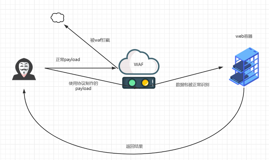 一些比较好的WAF已经对Transfer-Encoding的分块传输做了处理,可以把分块组合成完整的HTTP数据包,这时直接使用常规的分块传输方法尝试绕过的话,会被WAF直接识别并阻断。