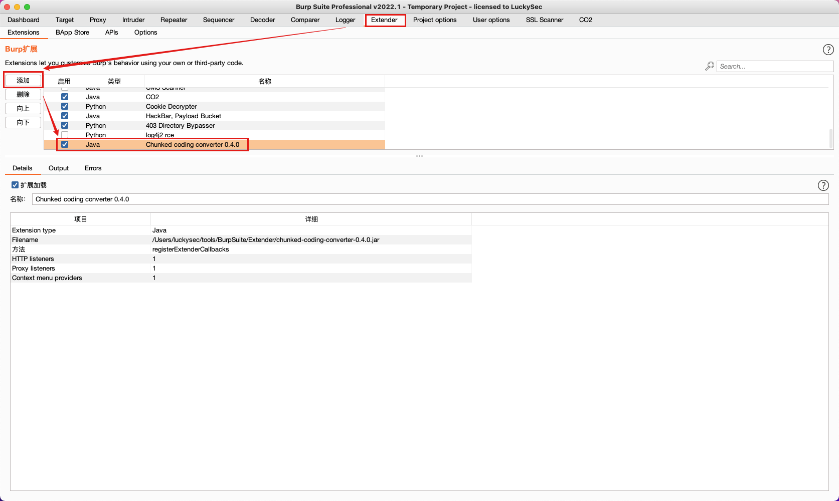 将分块传输插件下载到本地,并导入添加到BurpSuite扩展中使用